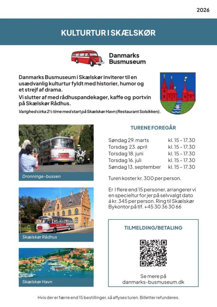 Danmarks Busmuseum i Skælskør inviterer til en usædvanlig kulturtur fyldt med historier, humor og et strejf af drama. Vi slutter af med rådhuspandekager, kaffe og portvin på Skælskør Rådhus.